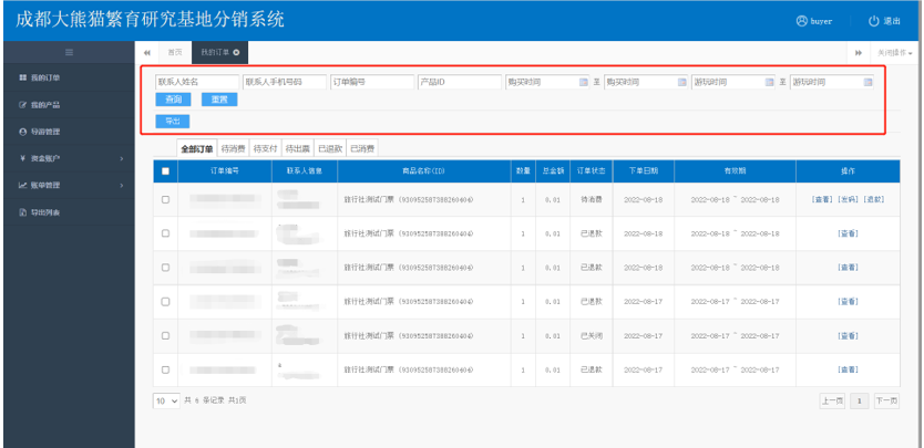 菜单栏选中我的订单,会显示所有的订单也可按条件对订单进行查询