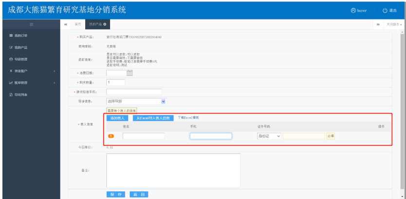 填入消费日期,购买数量,接受短信的手机及每位游客的信息(可使用excel进行导入)后,点击保存.